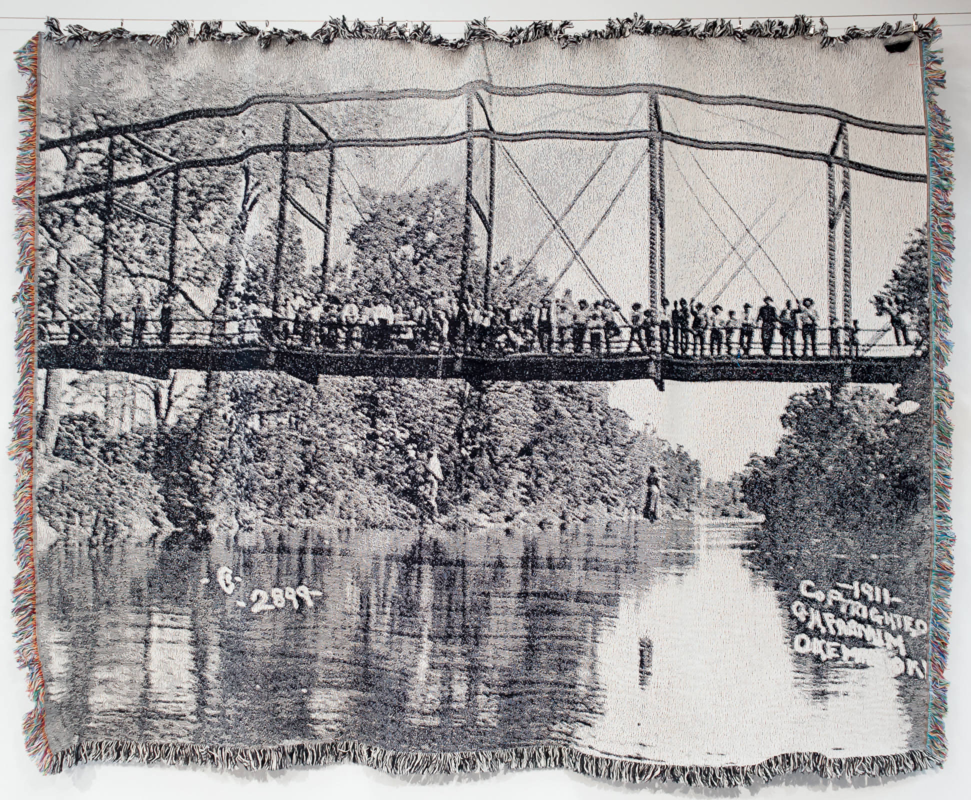 Each of the throw blankets in the stack depicts the image of a lynching or killing. They capture experiences of extreme human atrocity in objects designed for comfort, warmth, and safety.